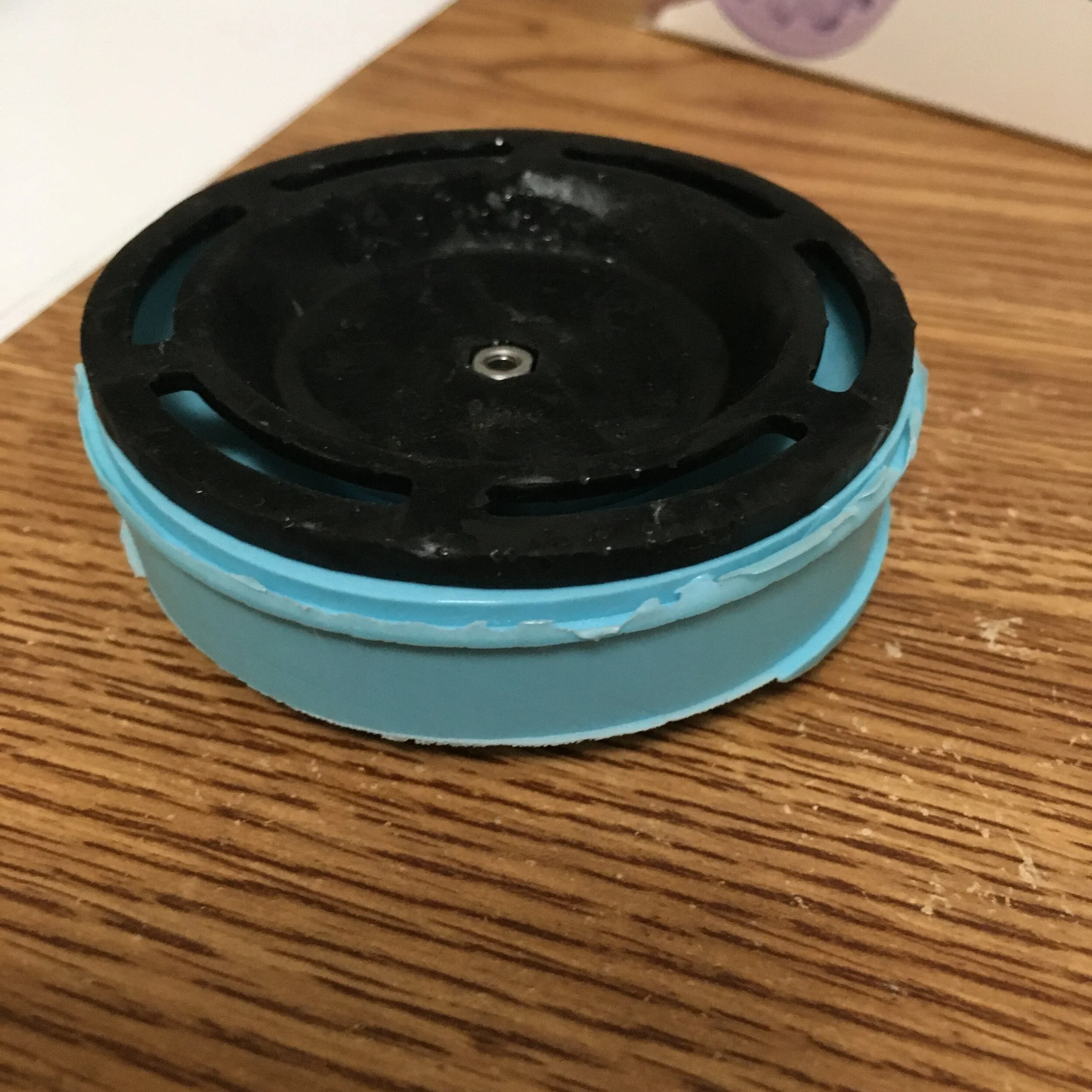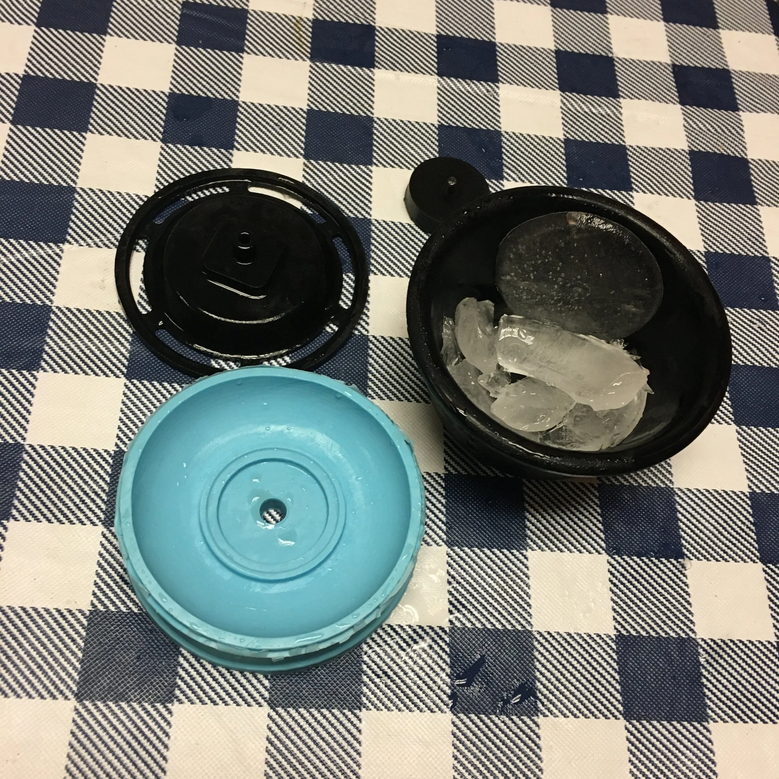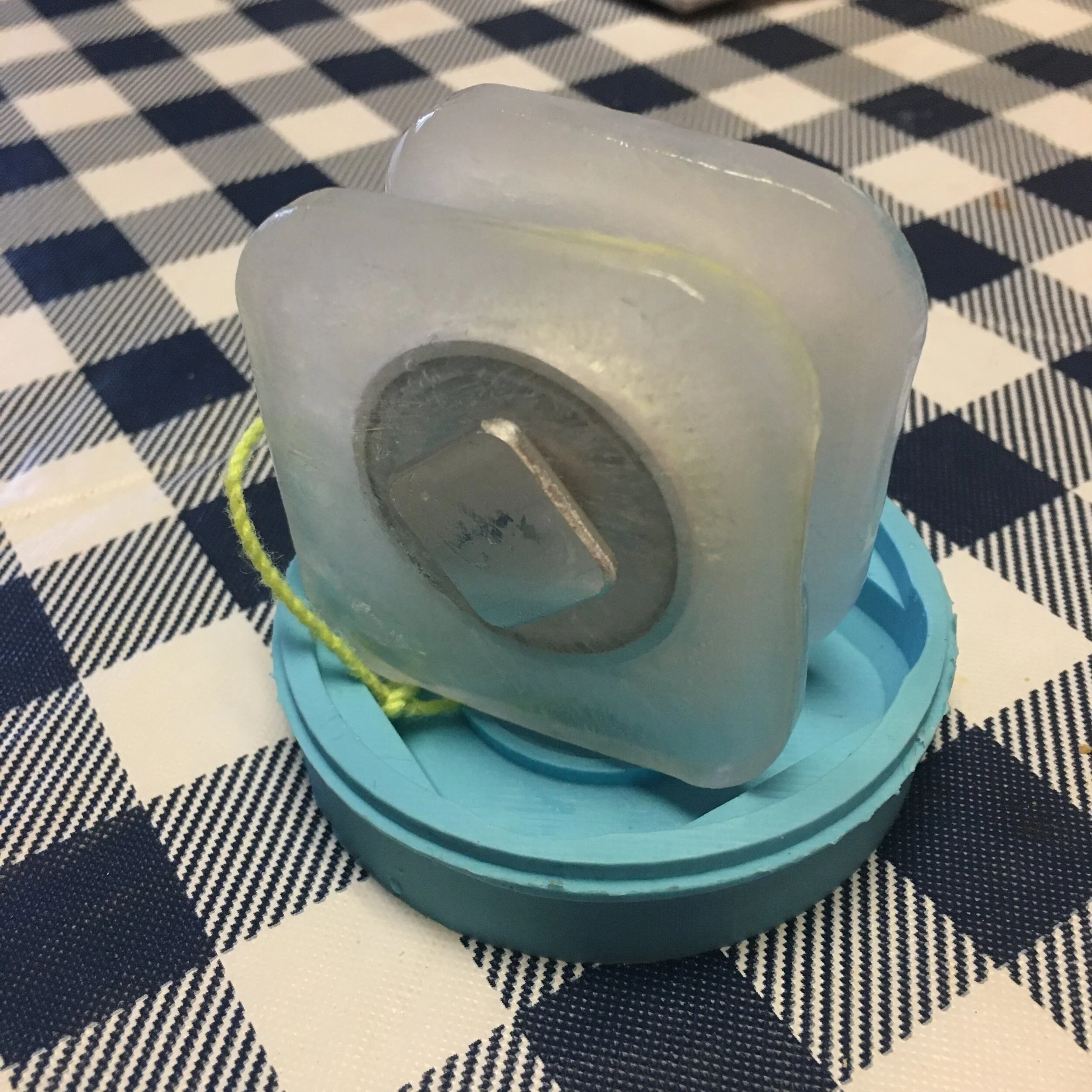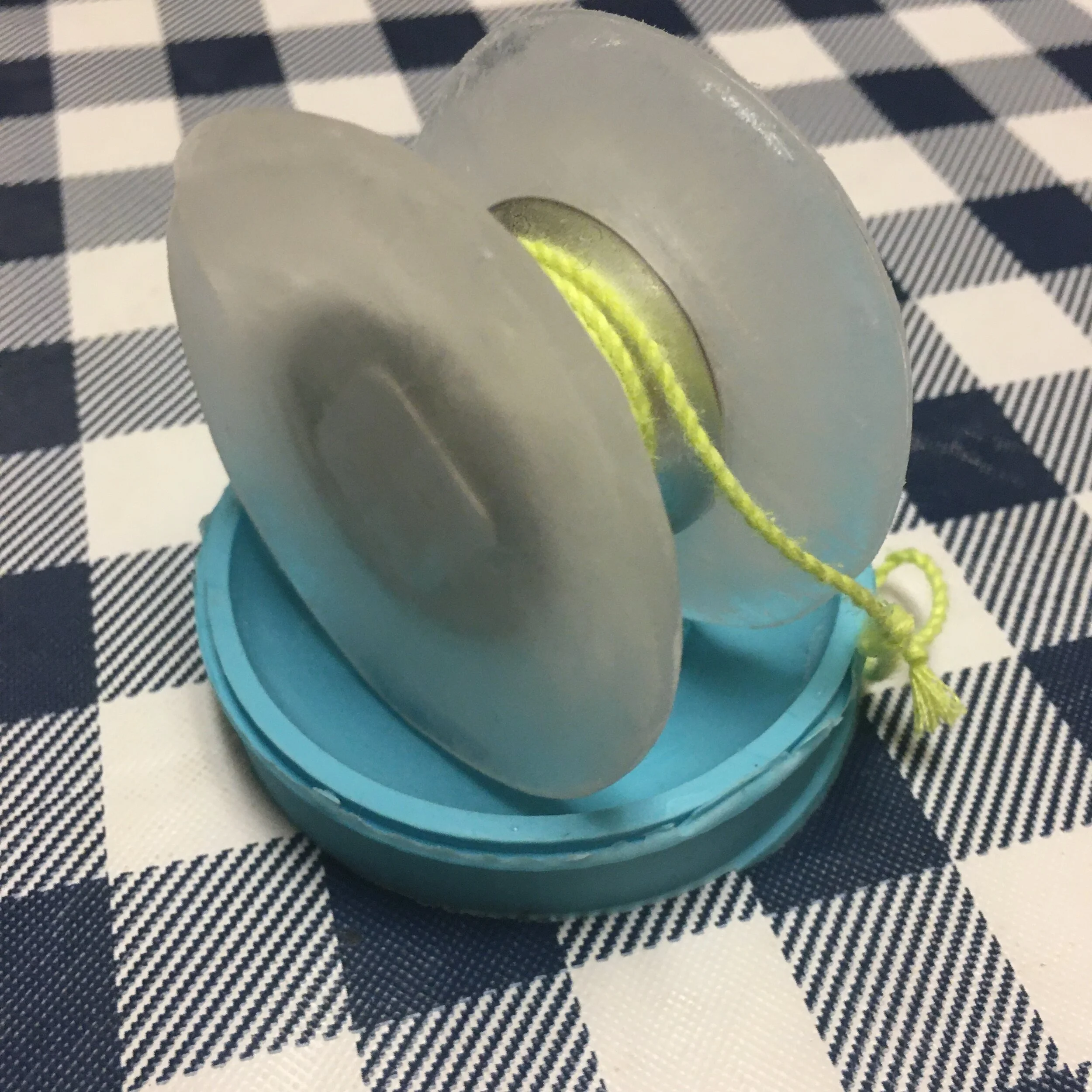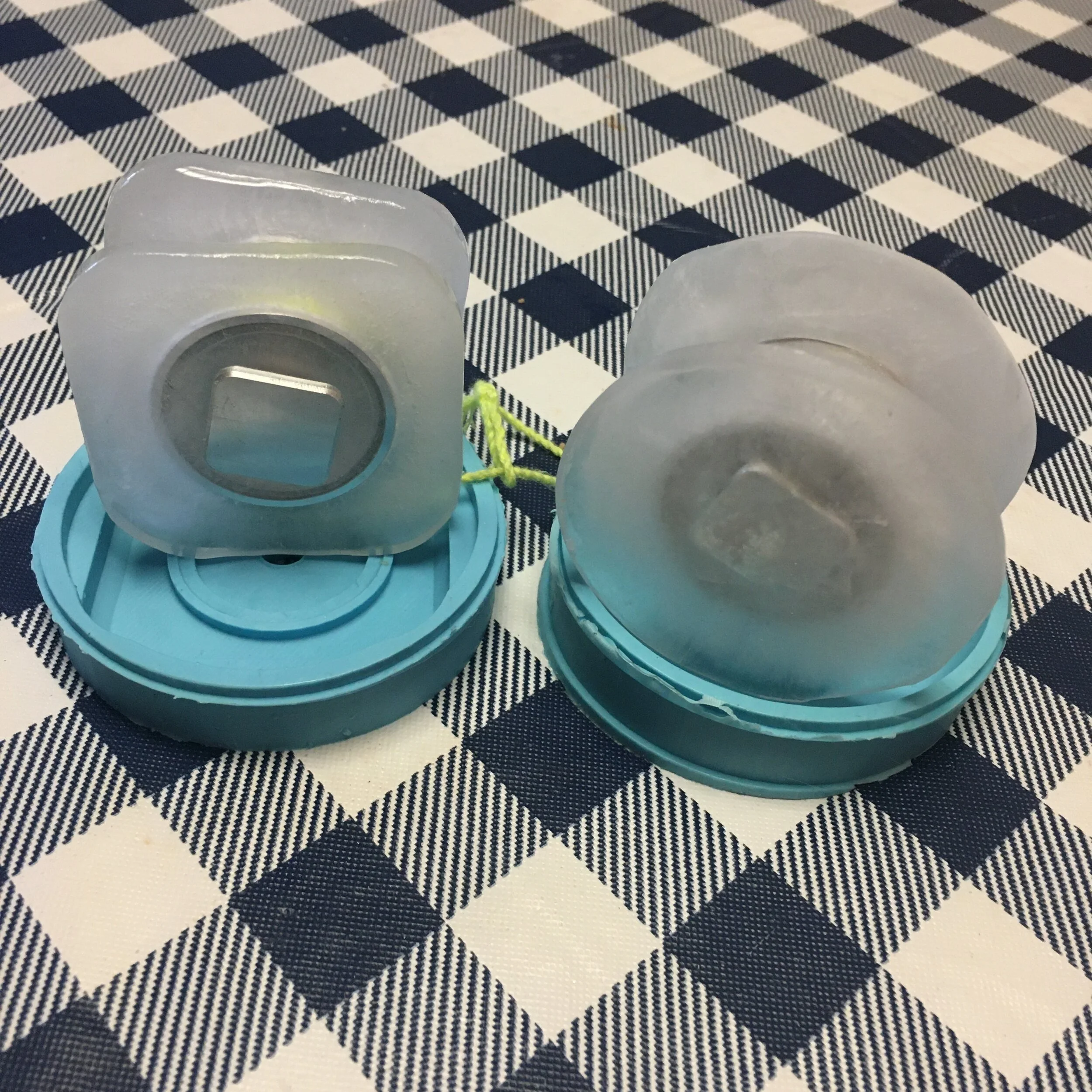 As for fixing the ice sticking to the mold, I changed the design to just utilize the soft portion of the mold, and with a little analysis to make sure my very uneven, unconcentric yoyo wouldn’t wobble, I made my first ice yoyo!