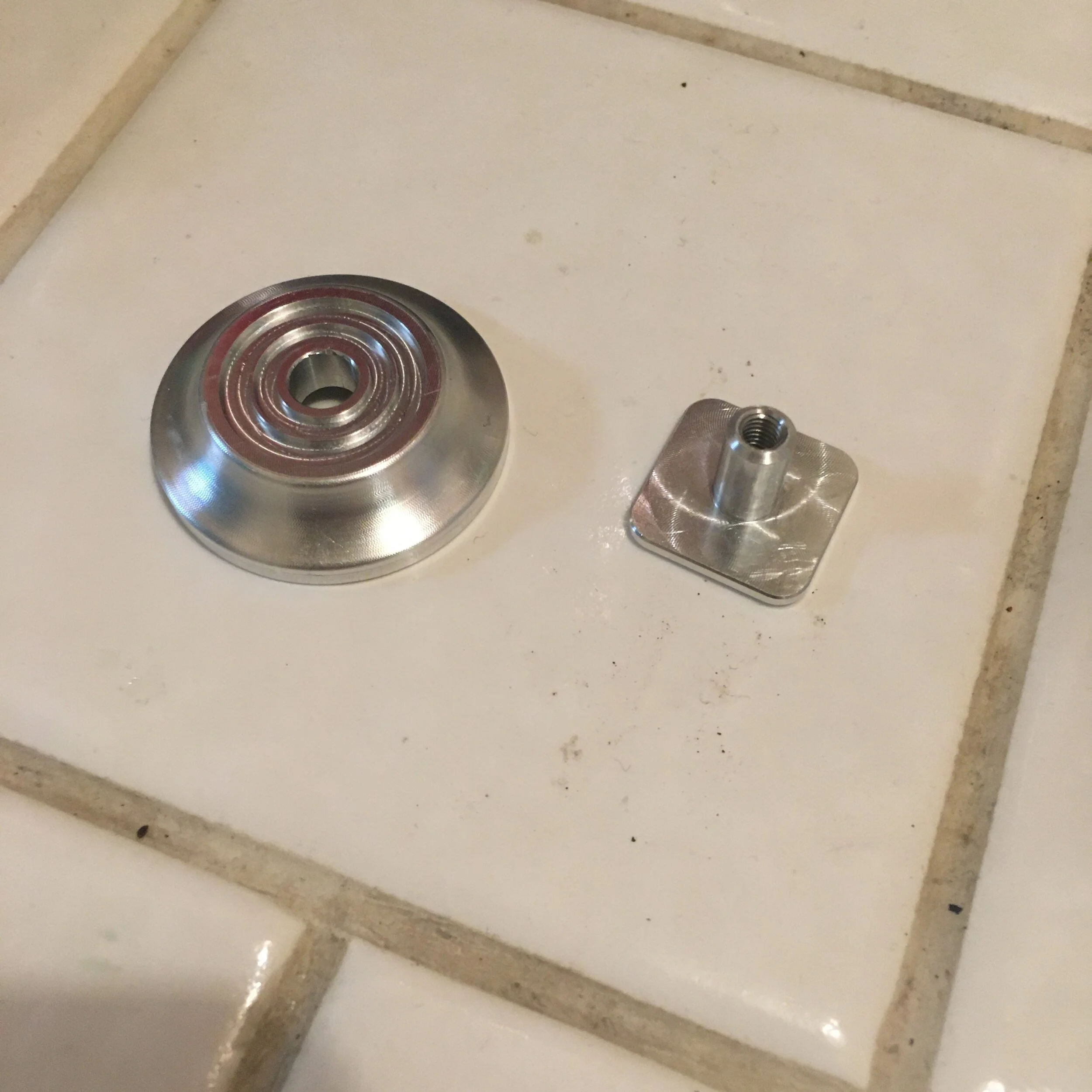 Anyway, delrin yoyos feel nice due to their smooth and relatively soft surface, but threads in delrin, and even a delrin bearing seat are mediocre. To fix this I designed the yoyo to essentially be a delrin sandwich which is clamped between two aluminum pieces, a threaded axle/hub, and a bearing seat.
