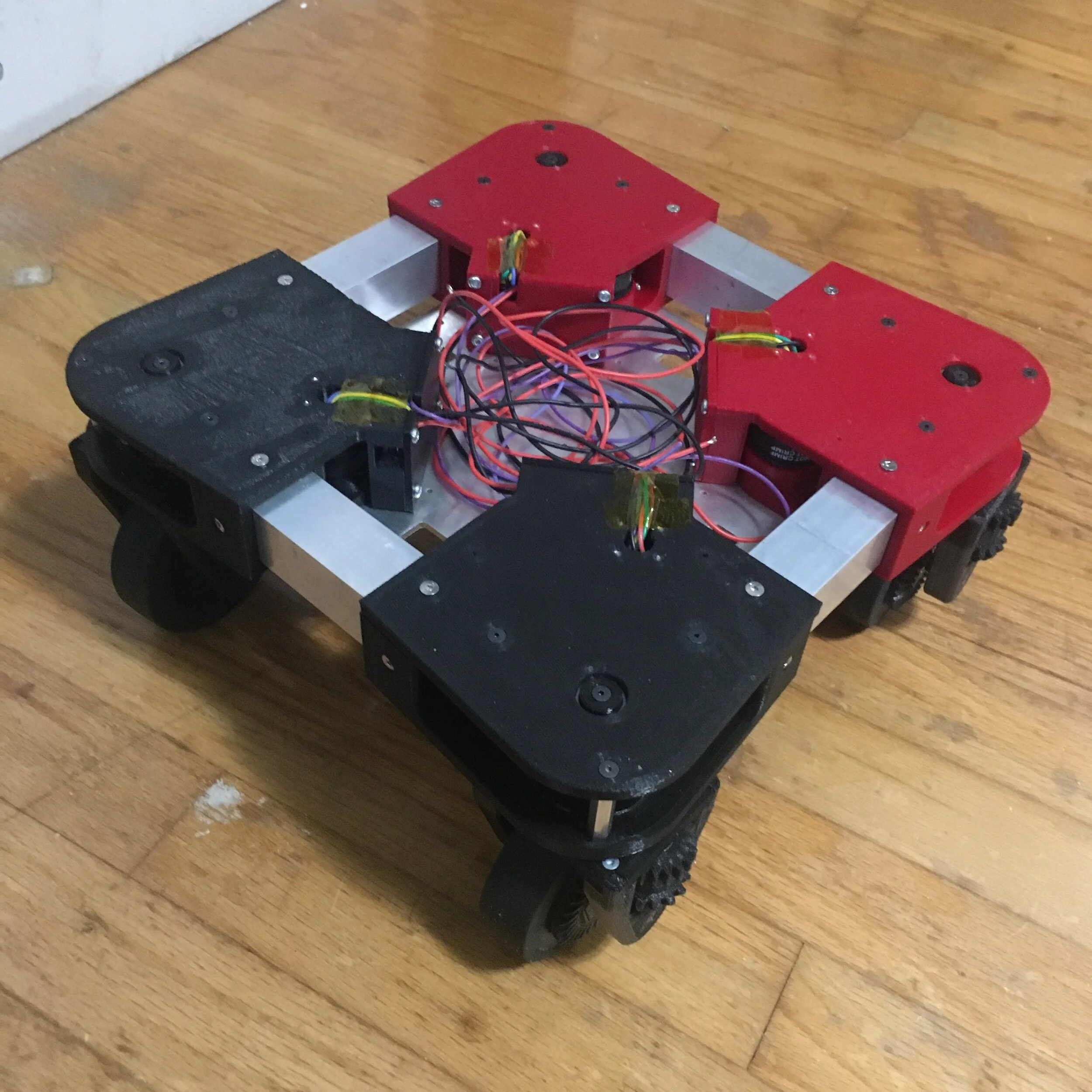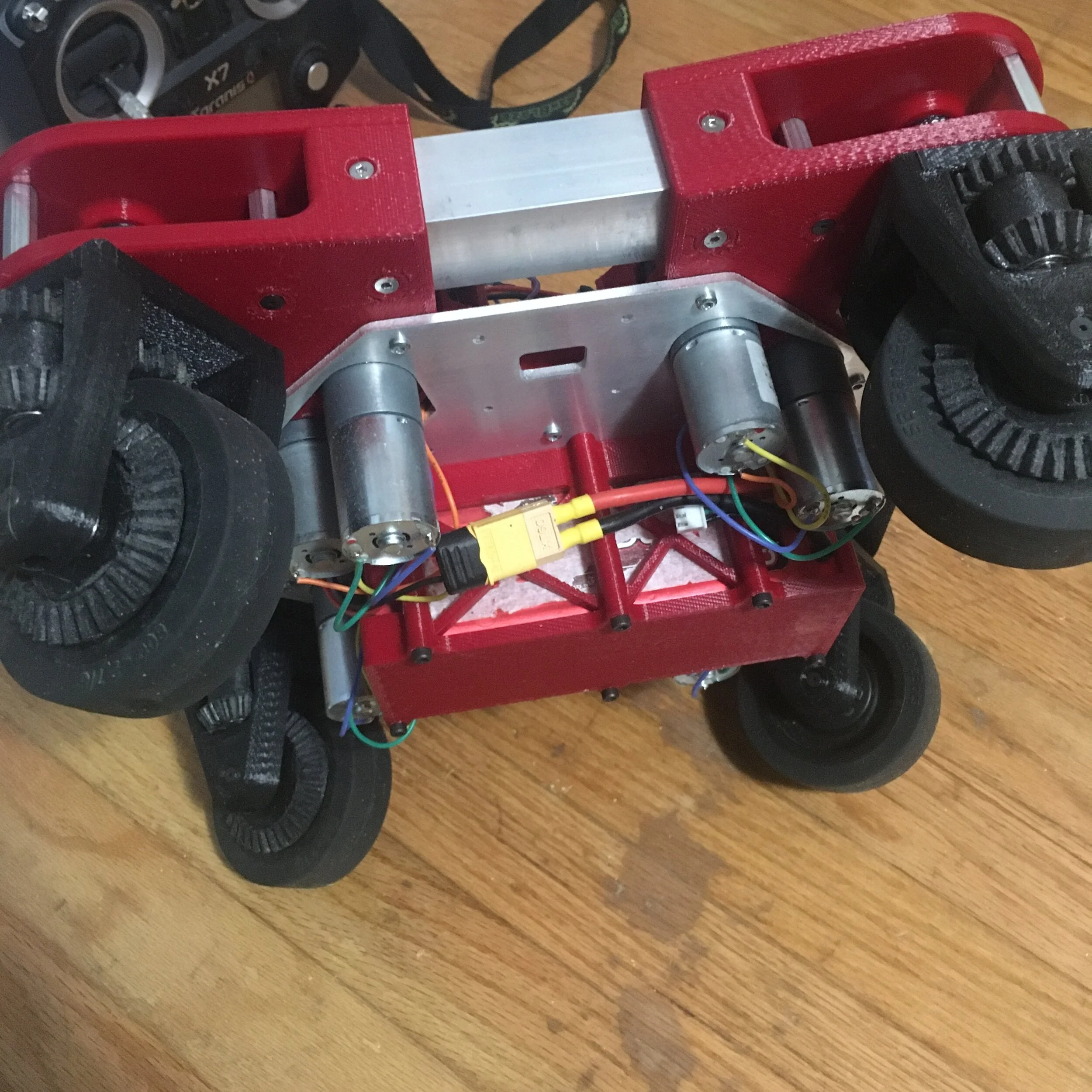 I whipped up a little electronics bay for the time being. It consists of the big white Nucleo, the green sbus receiver (Frsky XM+), and the blue IMU (BNO055). I might lay out a board to replace this contraption once I decide what mechanisms will be mounted to the top of the swerve. But I’m glad I stuck with jumper wires for the time being since plenty of my plans changed as I developed the firmware.